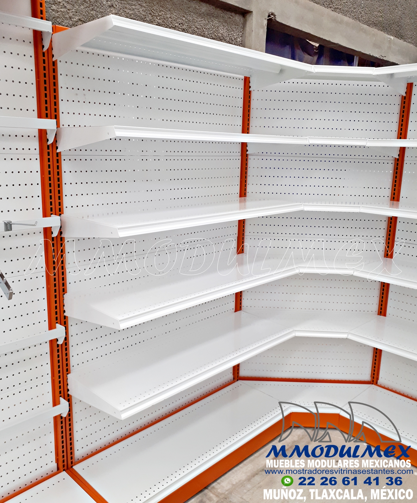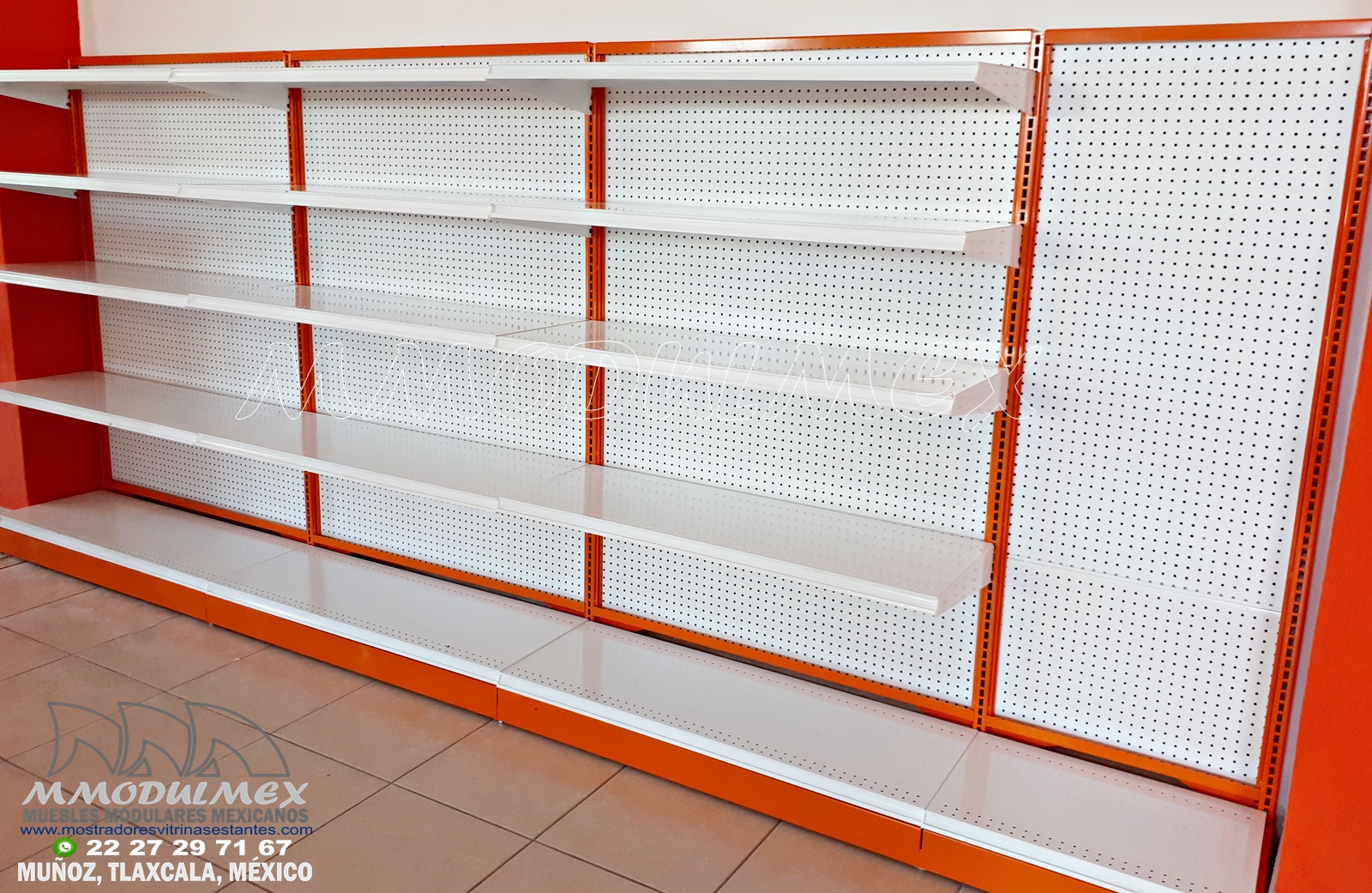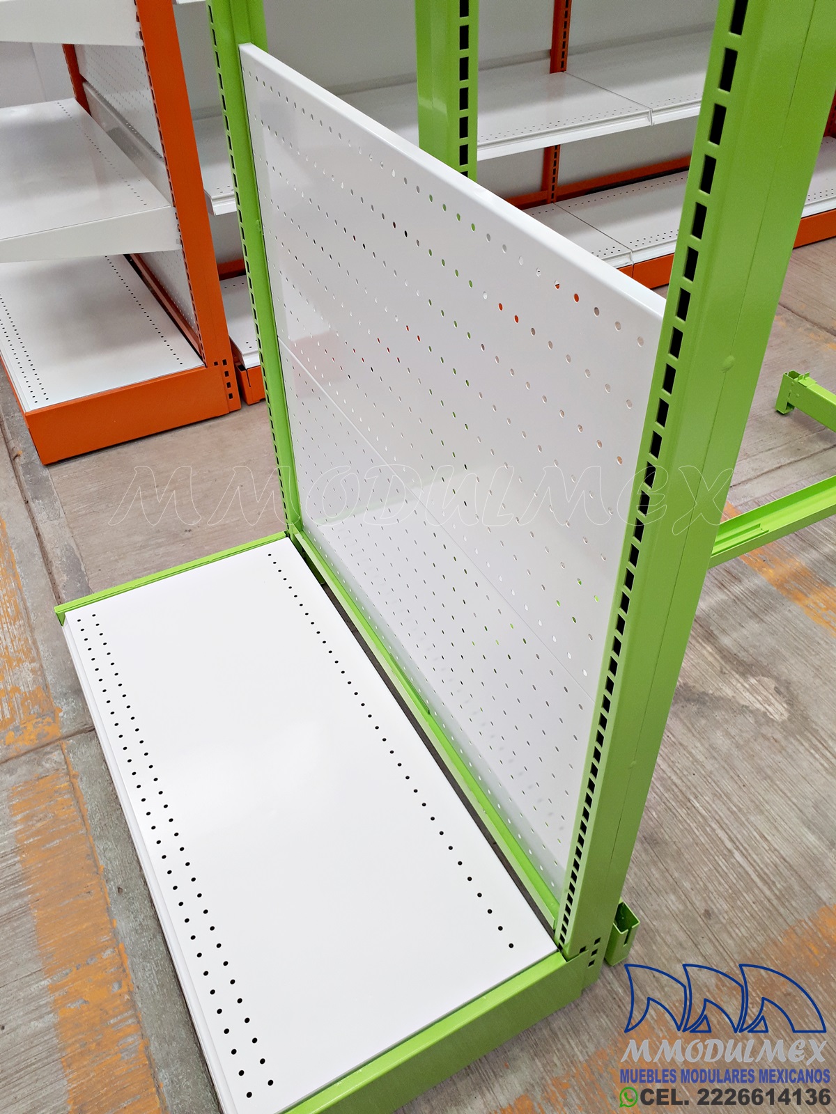 Con esas medidas se pueden hacer infinidad de configuraciones de medidas; pero también podemos fabricarlas a la medida que los clientes necesitan. En las divisiones o respaldos, también tenemos varias opciones para satisfacer las necesidades de exhibición de los clientes: Panel metálico liso; perforado metálico, perfocel de madera, panel ranurado o exhibipanel... todos ellos en las medidas y colores que el cliente solicita.